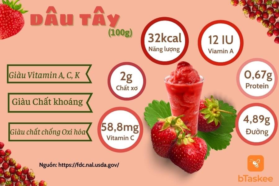 Tuy có kích thước nhỏ bé nhưng dâu tây lại chứa rất nhiều chất dinh dưỡng, vitamin và khoáng chất cần thiết cho cơ thể. Theo Bộ Nông nghiệp Hoa Kỳ, trung bình trong 100g dâu tây chứa: