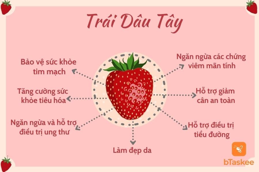 Dâu tây là một loại trái cây mang hương vị và màu sắc hấp dẫn được nhiều người ưa chuộng. Bên cạnh đó, dâu tây còn đem đến nhiều lợi ích thần kỳ cho sức khỏe chúng ta. Cùng bTaskee tìm hiểu về những công dụng và lưu ý khi dùng loại quả này nhé!