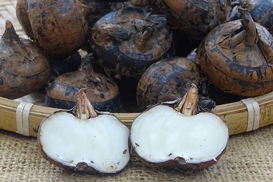 Khi củ chuyển sang màu nâu sẫm thì được thu hoạch, nó có kích thước nhỏ, được bao bọc bởi lớp vỏ nâu đen. Bên trong có phần thịt trắng, ăn có cảm giác giòn. Chúng ta có thể ăn sống hoặc nấu chín như xào, nấu trà sữa, nấu chè,…