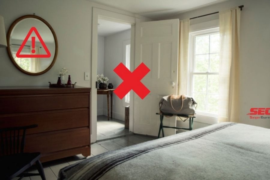 Gương chiếu vào cửa phòng: đặt gương chiếu vào cửa phòng ngủ có thể gây sự bất tiện bởi người khác có thể nhìn thấy hoạt động của bạn ở trong phòng. Khi mở cửa phòng thấy gương sẽ khiến nhiều người bị giật mình, khó chịu