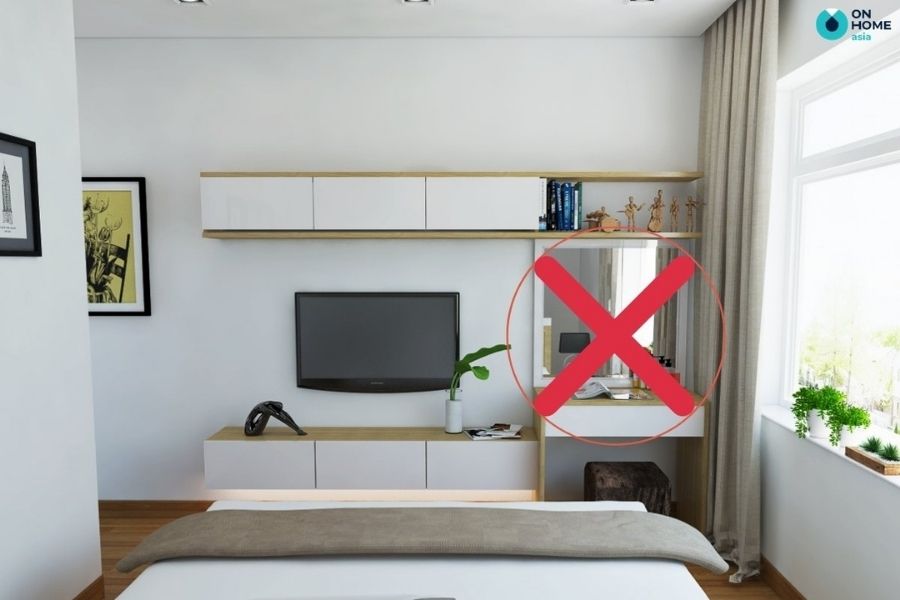 Gương chiếu trực tiếp vào mặt nhau: đặt hai gương đối diện nhau sẽ khiến cho các tia sáng phản chiếu lẫn nhau, điều này không có lợi cho việc điều tiết và tập hợp năng lượng trong phòng ngủ.