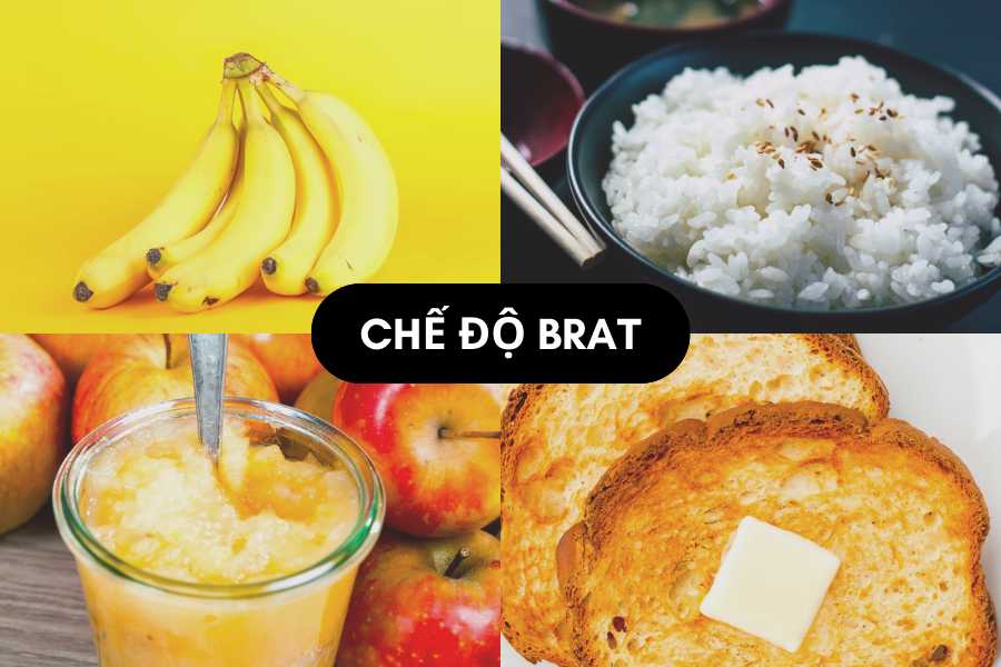 BRAT là viết tắt của Bananas – Rice – Applesauce – Toast (Chuối – Gạo – Sốt táo – Bánh mì nướng). Những thực phẩm này có nhiều chất dinh dưỡng như Kali và Magie, có thể thay thế những chất bị mất do tiêu chảy và nôn mửa.