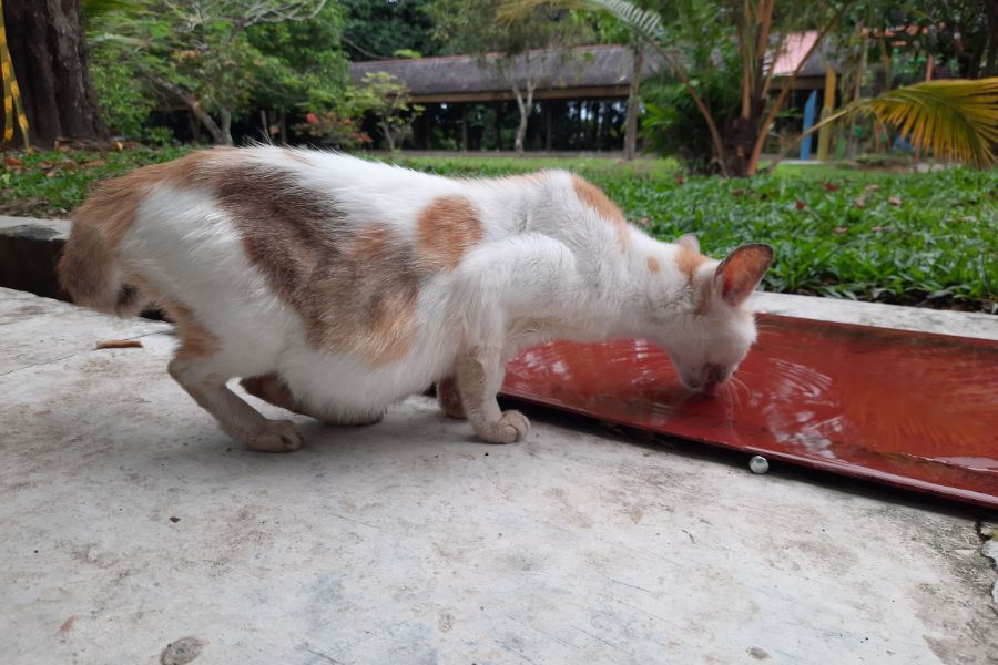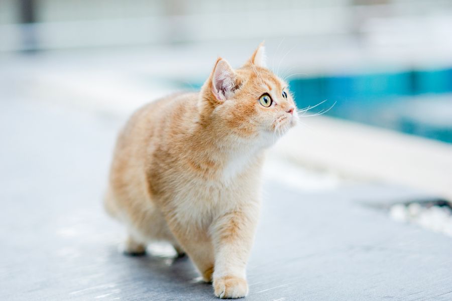- Khi đi bụng mèo sẽ võng xuống. Mèo sẽ khá giống một con lừa con, lưng hơi gù và phần bụng hai bên phình lên, có chỗ nhô hẳn ra và cứng hơn bình thường. Bụng gò lên không đều do nước ối chảy dần ra ngoài. Đồng thời, tay, chân và cổ của mèo sẽ to hơn bình thường.