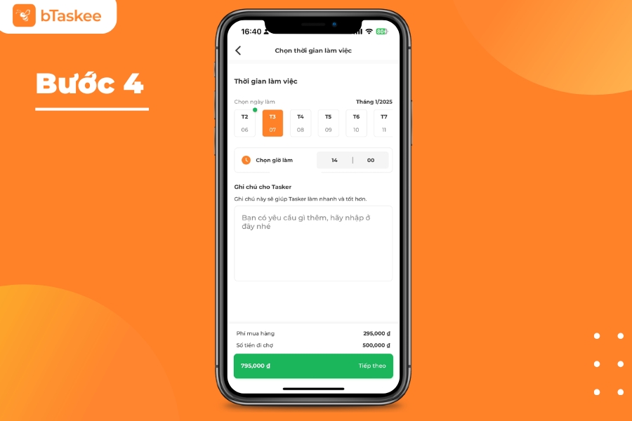 Bước 4: Chọn thời gian làm việc và ghi chú (nếu có).