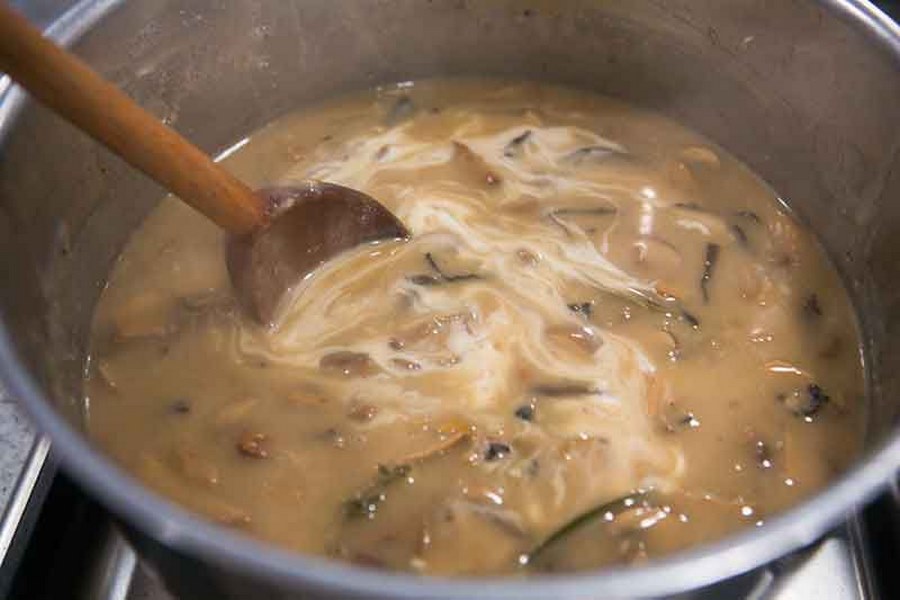 - Bước 2: Cho một muỗng sữa tươi và một thìa muối trộn đều với nấm khoảng 5 phút. Để sốt có độ sánh mịn thì bạn pha hỗn hợp bột bắp để đổ vào, tiếp tục khuấy đều và nếm thử cho đến khi vừa ăn.