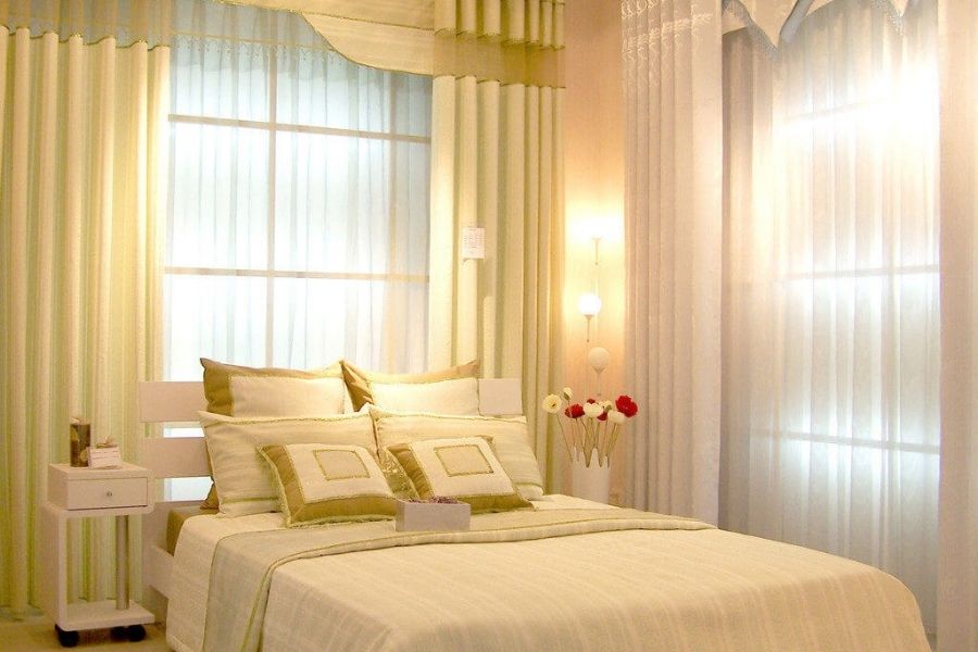 Rèm roman hoặc các loại rèm lật cản nắng được sử dụng rất phổ biến hiện nay. Nếu bạn decor phòng ngủ theo phong cách nhẹ nhàng thì nên chọn rèm mỏng, màu trắng hoặc kem. Những gam màu này sẽ tăng tính thẩm mỹ và tạo nên không gian lãng mạn.