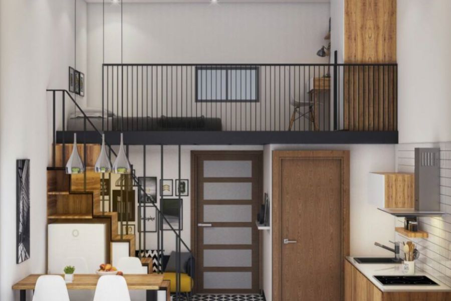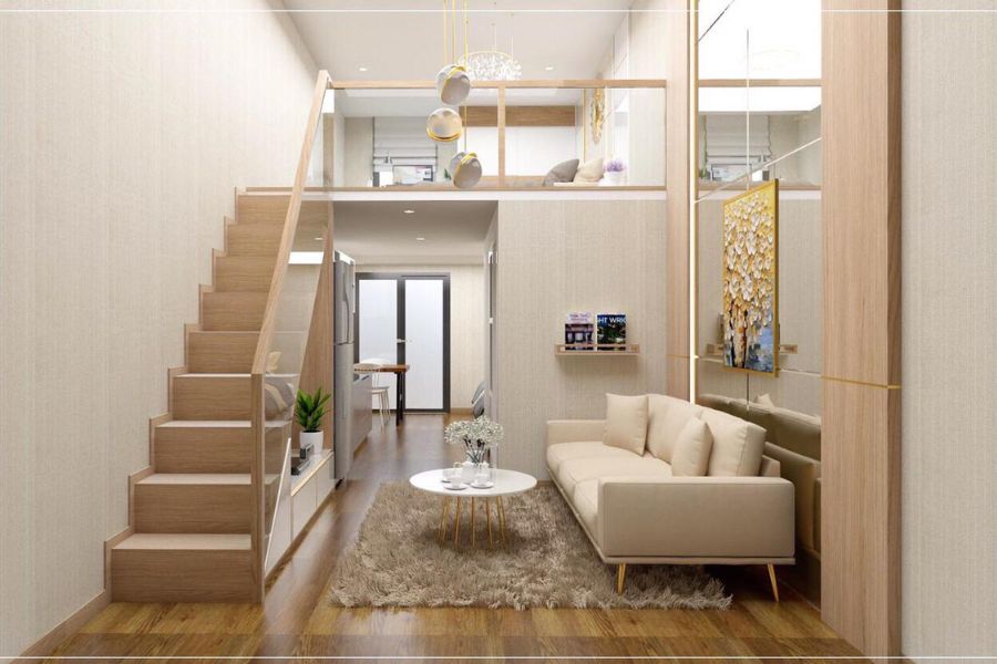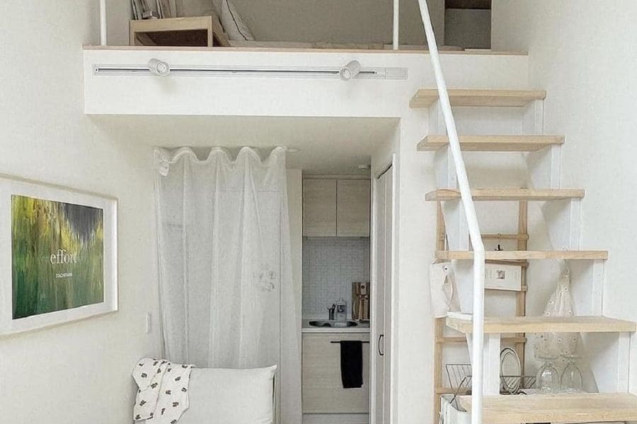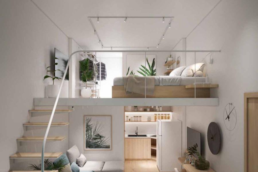 Với diện tích 20m2, bạn có thể phân chia căn phòng thành các khu vực với chức năng đầy đủ như bếp, phòng khách và phòng ngủ bên trên gác lửng, đều rất thuận tiện.