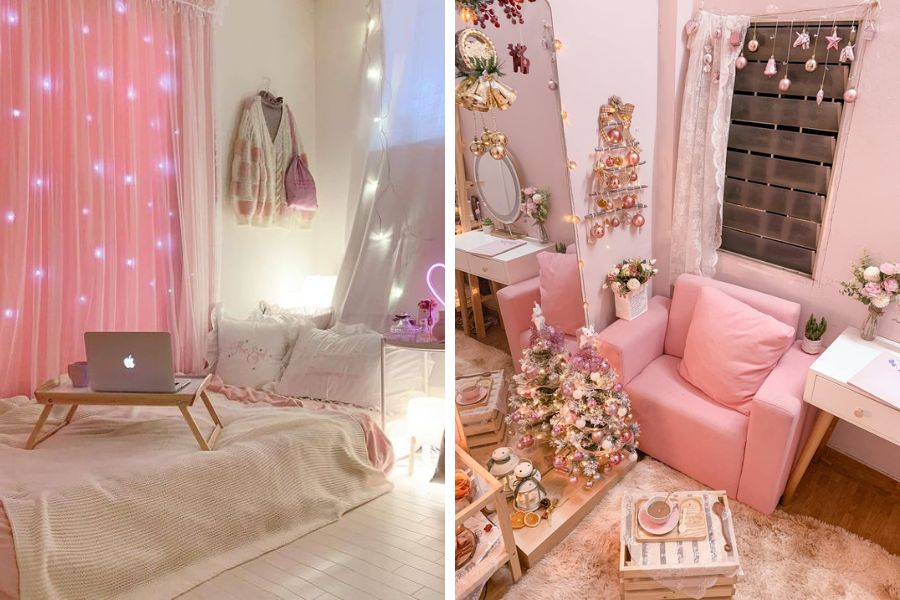 - Các chi tiết trang trí điệu đà như lọ hoa, đèn led, thảm lông,… là những món đồ không thể thiếu để thể hiện nét nữ tính của những cô nàng bánh bèo.