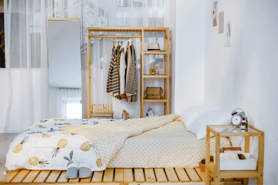 - Giường ngủ: Bạn nên lựa chọn các loại giường như pallet hoặc nệm. Với các căn phòng có gác xép thì giường ngủ nên được bố trí trên đó để tiết kiệm không gian tối đa.