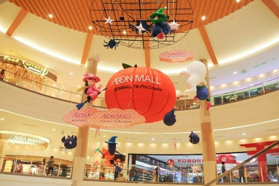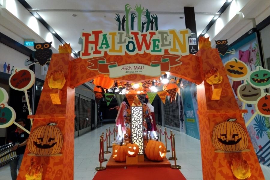 AEON Mall Bình Tân và AEOn Mall Tân Phú cũng là một trong những địa điểm nổi tiếng và sôi động để bạn, gia đình và bạn bè vui chơi trong dịp Halloween tại Sài Gòn. Trong thời gian này, toàn bộ AEON Mall, bao gồm các cửa hàng, rạp chiếu phim, khu vui chơi và nhà hàng, đều được trang trí theo phong cách đặc trưng của lễ hội Halloween.