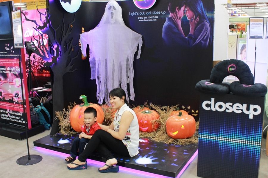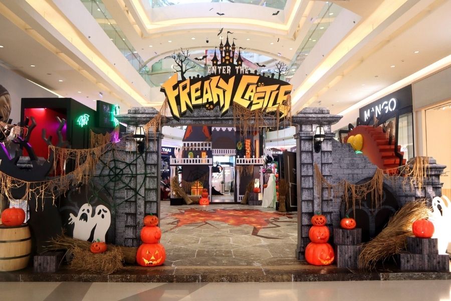 Các trung tâm thương mại cũng là điểm đến quen thuộc cho các bạn trẻ vào ngày Halloween. Hầu như trung tâm nào cũng sẽ trang trí background hưởng ứng ngày hội hóa trang.