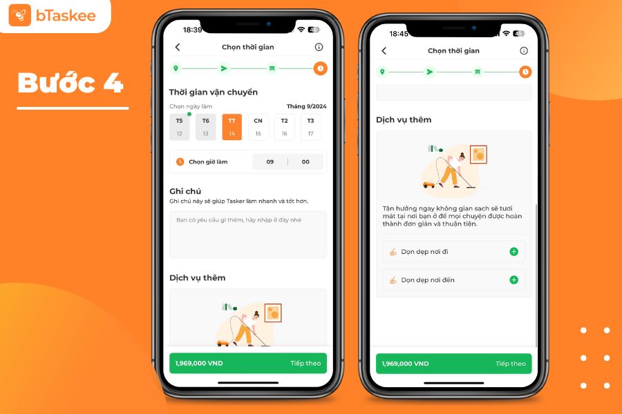 - Tùy chọn thêm dịch vụ “Dọn dẹp nơi đi” và “Dọn dẹp nơi đến” nếu có nhu cầu.