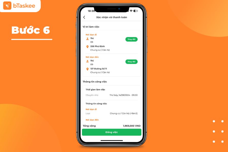 Xác nhận lại thông tin, chọn phương thức thanh toán, mã khuyến mãi (nếu có) và bấm “Đăng việc”.