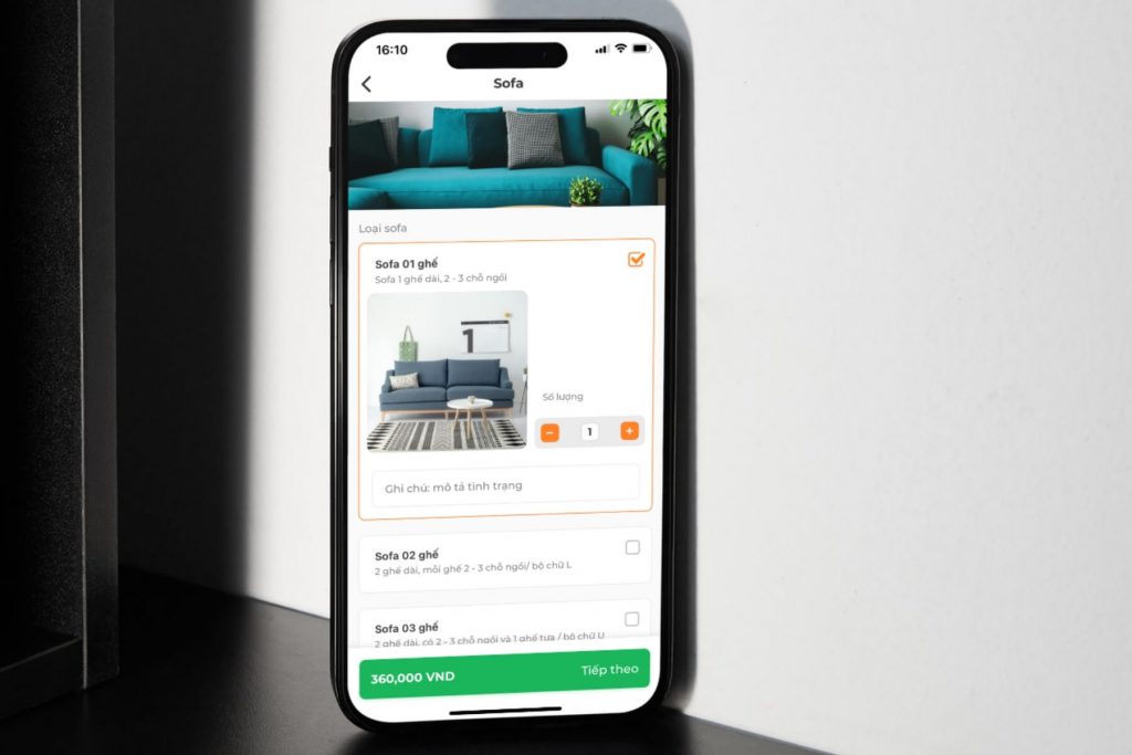 Thay vì phải gọi điện và chờ đợi phản hồi như các dịch vụ truyền thống, bạn có thể đặt lịch giặt sofa chỉ trong 60 giây trên app bTaskee. Quy trình đặt lịch rất đơn giản: chọn địa chỉ, chọn loại sofa cần vệ sinh, chọn thời gian phù hợp và xác nhận thanh toán.
