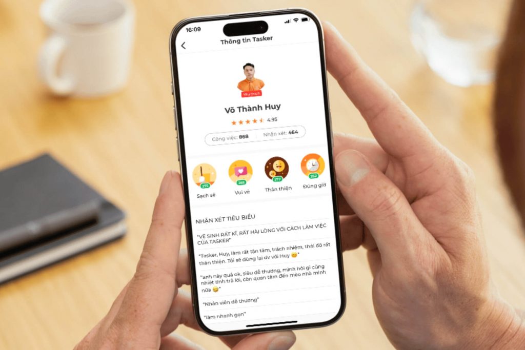 Thông tin của mỗi Tasker được hiển thị minh bạch trên app bao gồm tên, ảnh đại diện, đánh giá từ khách hàng trước đó và mã QR riêng biệt. Điều này giúp bạn hoàn toàn yên tâm về chất lượng dịch vụ từ con người.