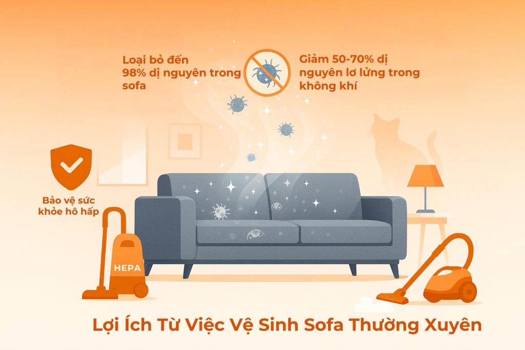 Kiểm soát bụi mạt giường: Sofa chứa 30% quần thể bụi mạt toàn nhà theo báo cáo của Carpet & Rug Institute. Hút bụi HEPA định kỳ có thể làm giảm 50-85% tải mạt chỉ sau 5 tuần.