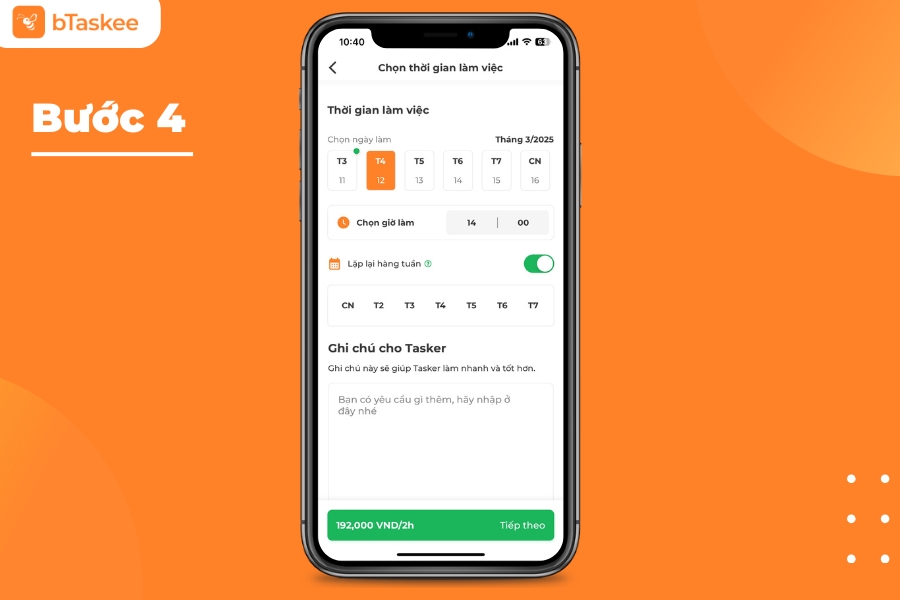 Chọn ngày và giờ bạn muốn Tasker đến làm việc. Hệ thống sẽ hiển thị các khung giờ còn trống để bạn lựa chọn.