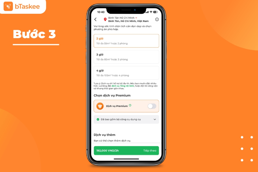 Chọn số giờ phù hợp với diện tích nhà của bạn (2, 3 hoặc 4 giờ). Thêm các dịch vụ bổ sung nếu cần như ủi đồ, nấu ăn, hoặc dịch vụ Premium.