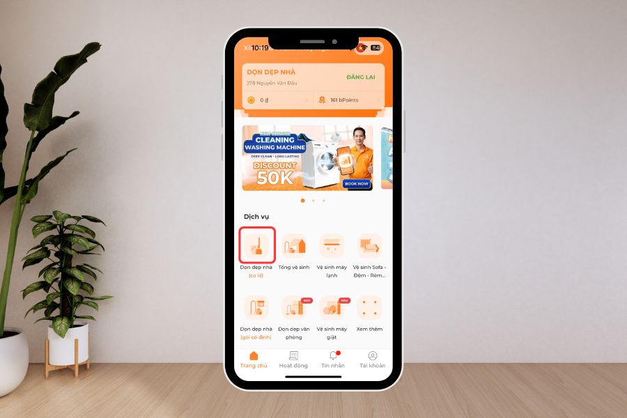 Nhấn vào biểu tượng dọn dẹp nhà trên màn hình chính.