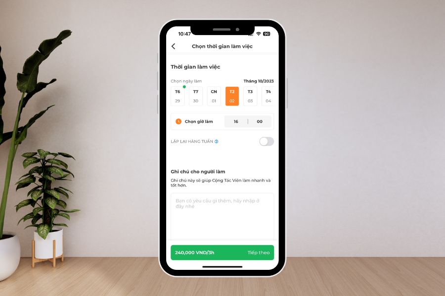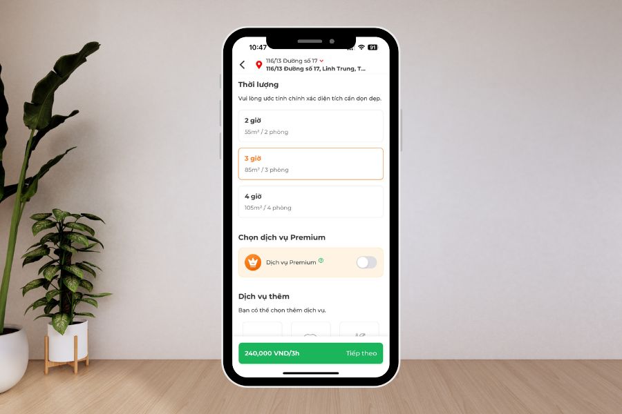 Chọn thời lượng vệ sinh và các dịch vụ khác đi kèm (Nấu ăn, ủi đồ, mang theo dụng cụ) cùng các tùy chọn khác.