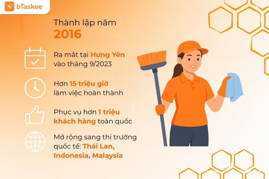 Thành lập năm 2016, bTaskee có đăng ký kinh doanh đầy đủ và là nền tảng công nghệ kết nối dịch vụ giúp việc nhà theo giờ tiên phong tại Việt Nam. bTaskee ra mắt tại Hưng Yên tháng 9/2023.