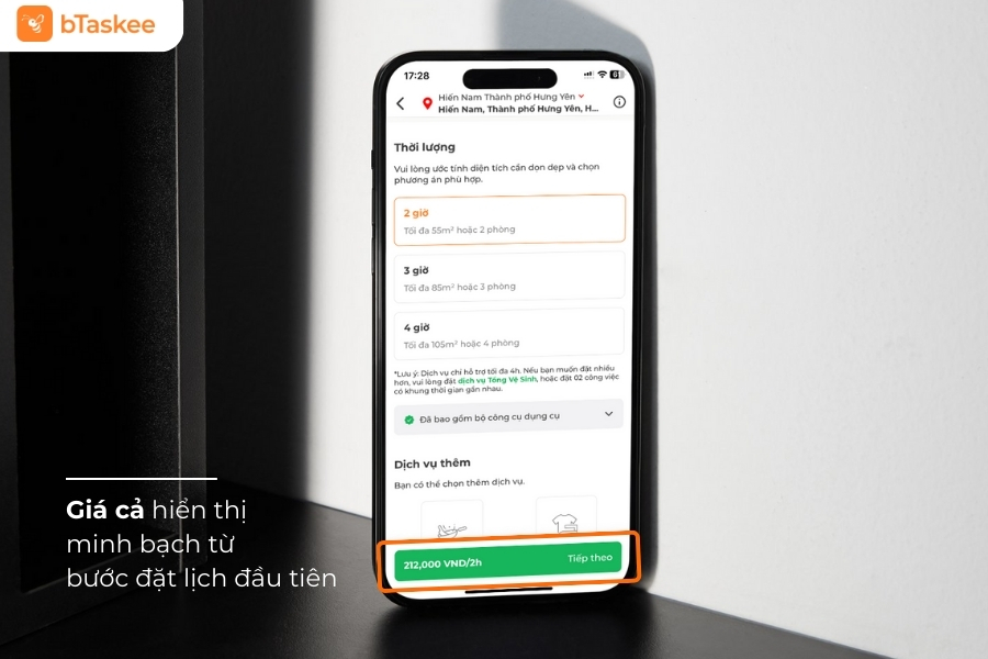 Bảng giá của bTaskee được công khai minh bạch trên ứng dụng, giúp khách hàng dễ dàng nắm rõ mức phí trước khi đặt lịch.