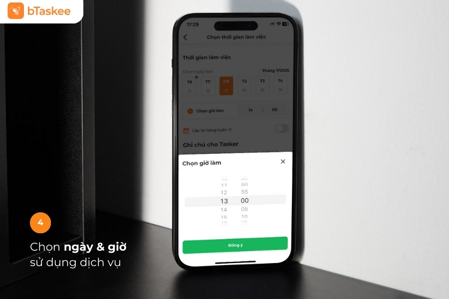 Khách hàng có thể đặt lịch bất cứ lúc nào, ở bất cứ đâu, chỉ trong vài thao tác qua ứng dụng bTaskee. Dễ dàng chọn hoặc thay đổi thời gian, địa điểm linh hoạt, kể cả trong ngày hoặc đặt lịch trước nhiều ngày.