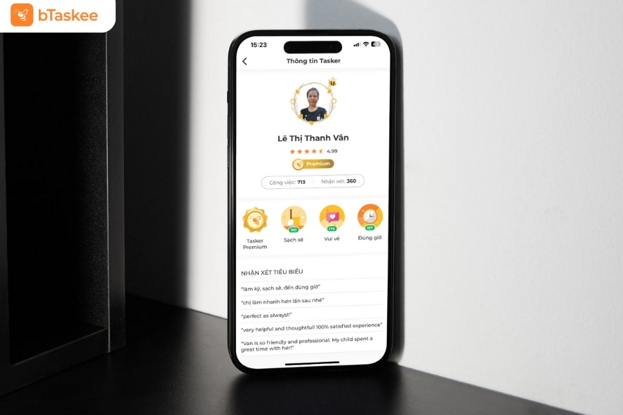 Trước khi đặt, khách hàng được xem rõ hồ sơ Tasker: tên, ảnh, số giờ làm, số lượt đánh giá, và đánh giá từ khách cũ. Giúp người dùng hoàn toàn yên tâm về người sẽ đến nhà mình làm việc.