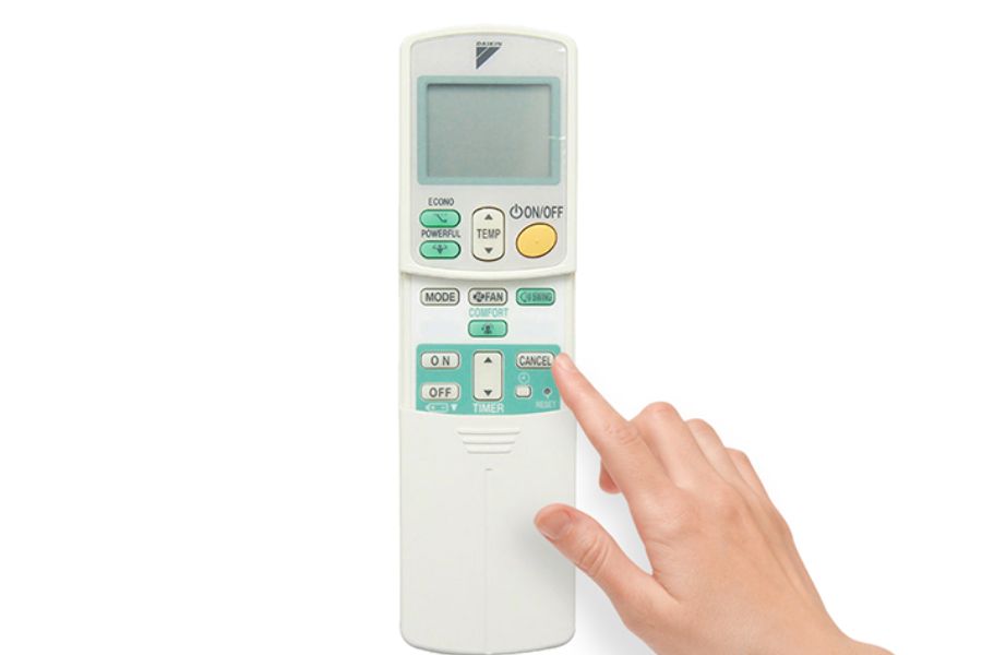 - Bước 1: Hướng điều khiển về phía dàn lạnh. Sau đó ấn vào nút Cancel trên điều khiển trong vòng 5s. Lúc này điều khiển sẽ hiển thị mã lỗi trên màn hình kèm theo tín hiệu đèn nhấp nháy. Màn hình điều khiển lúc này đang hiển thị “00”. Đây chính là mã hiển thị mặc định trong chương trình “Test lỗi” của các dòng điều hòa thuộc hãng Daikin.