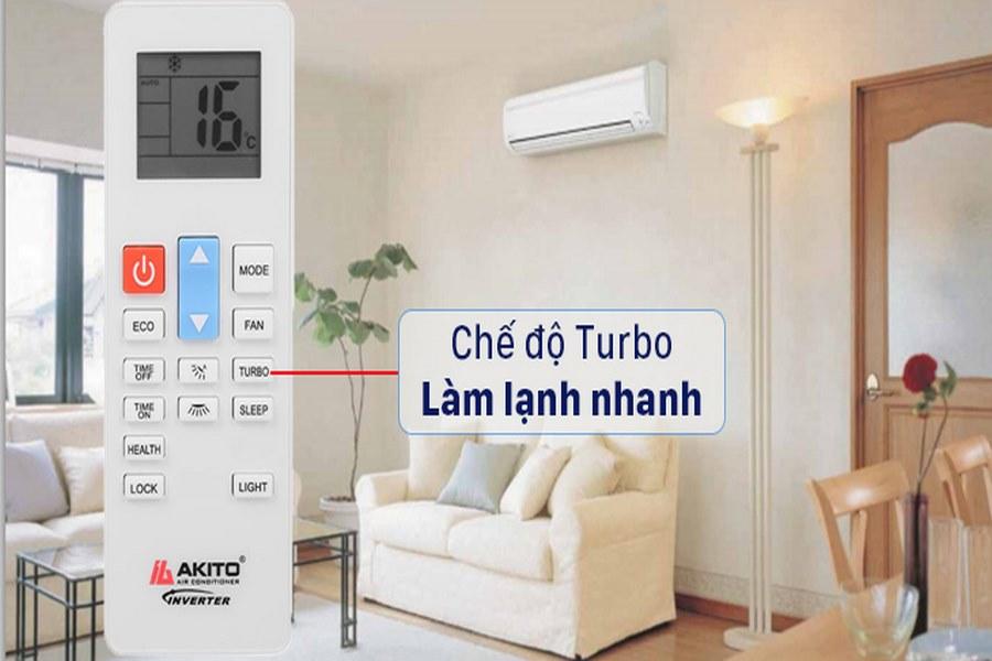Cơ chế này của điều hòa Akito sẽ tương ứng với nút TURBO ở trên điều khiển. Khi bạn kích hoạt tính năng làm lạnh nhanh TURBO, động cơ của điều hòa sẽ làm việc với công suất lớn hơn để làm lạnh nhanh cho căn phòng của bạn. Nhiệt độ trong phòng sẽ nhanh chóng được hạ thấp trong thời gian 20 – 30 phút.
