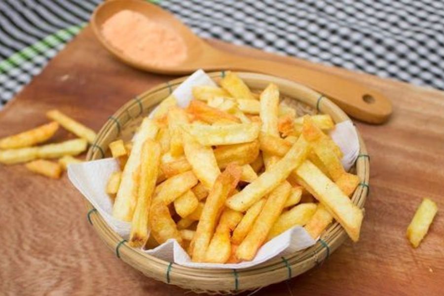 Khoai tây chiên là món ăn vặt tiện lợi và luôn có mặt trong thực đơn của các quán ăn tại Việt Nam. Đây là món ăn đơn giản được làm từ khoai rán và có thể kết hợp cùng đường, bơ, hoặc tương ớt để kích thích sự ngon miệng.