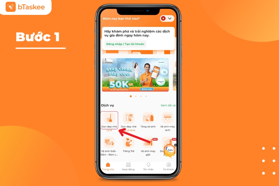 Bước 1: Vào app bTaskee và chọn dịch vụ “Dọn dẹp nhà”.