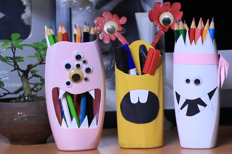 Tái chế chai nhựa thành đồ chơi là những hộp bút màu sắc, hình thù dễ thương sẽ giúp các bé thêm hứng thú học tập hơn.