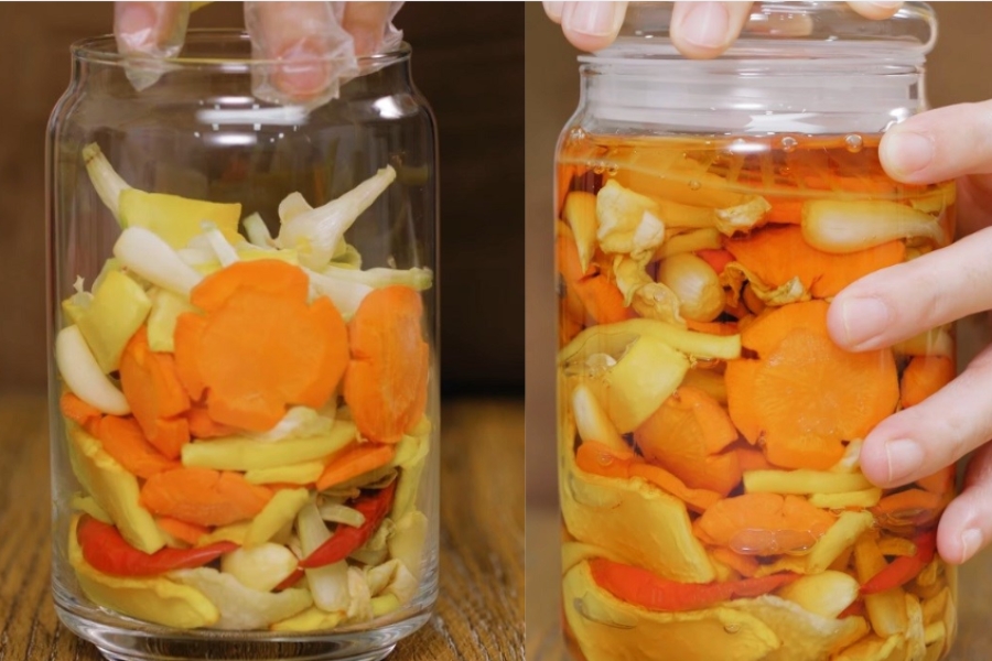Lưu ý: Cần đảm bảo nước muối ngập hết rau củ để ngâm đều.