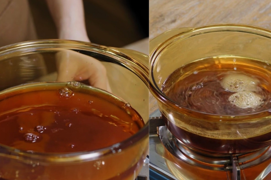 - Đun sôi hỗn hợp trên lửa nhỏ, khuấy đều cho đường tan hết và nước mắm có mùi thơm đặc trưng.