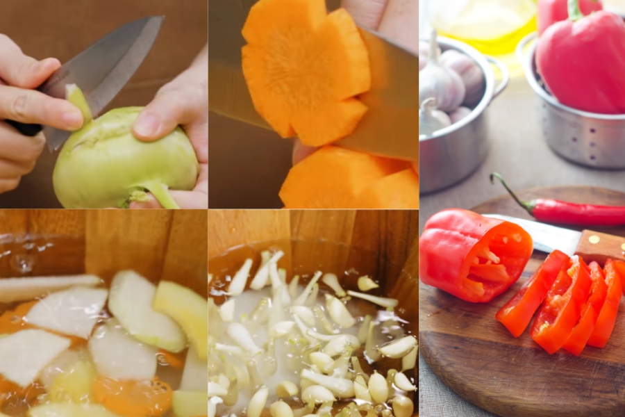 - Sau khi cắt, ngâm rau củ vào nước muối pha loãng (tỉ lệ muối và nước khoảng 1:5) trong khoảng 30 phút để rau củ giòn và không bị hăng.