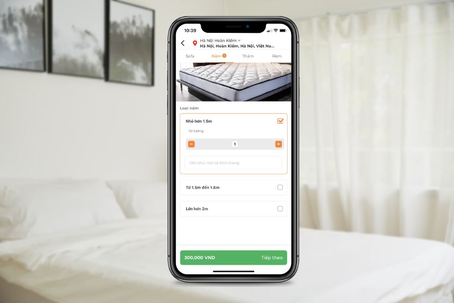 - Bước 3: Lựa chọn kích thước nệm. Tại đây bạn có thể mô tả tình trạng nệm để CTV thực hiện công việc nhanh chóng và dễ dàng hơn.