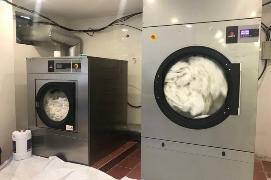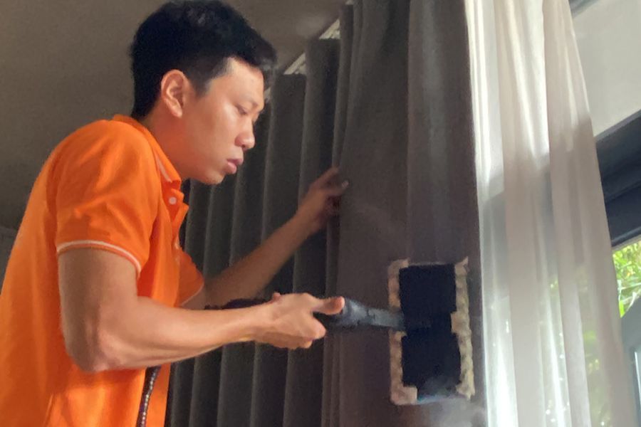 - Bước 3: Làm sạch rèm: Sử dụng chất tẩy rửa chuyên dụng để loại bỏ hoàn toàn bụi bẩn. Làm sạch rèm với máy giặt công nghiệp khử trùng và xả thơm vải.