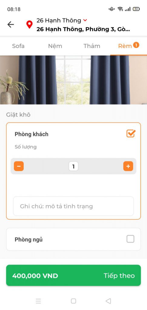 Bước 3: Chọn dịch vụ giặt “Rèm”, chọn hình thức giặt rèm và khối lượng cần giặt.