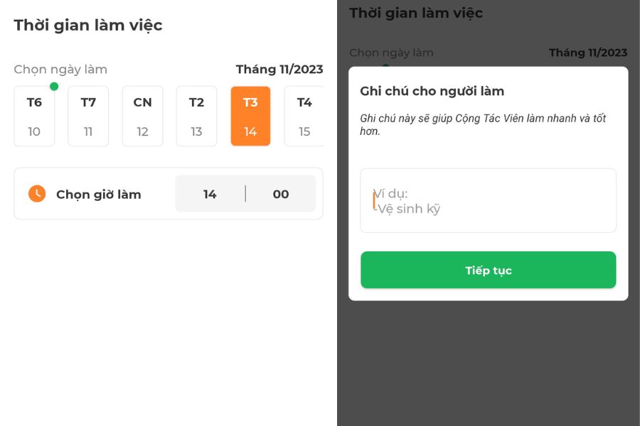 - Bước 5: Chọn ngày làm cụ thể và nhấn nút Tiếp theo, điền ghi chú nếu có.