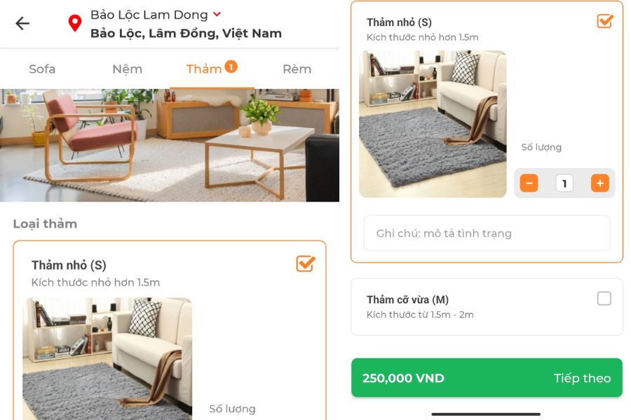 - Bước 4: Chọn loại thảm, kích thước và số lượng phù hợp. Lúc này, màn hình sẽ hiển thị mức giá, nếu đồng ý bạn nhấn chọn Tiếp theo ở phần dưới cùng.