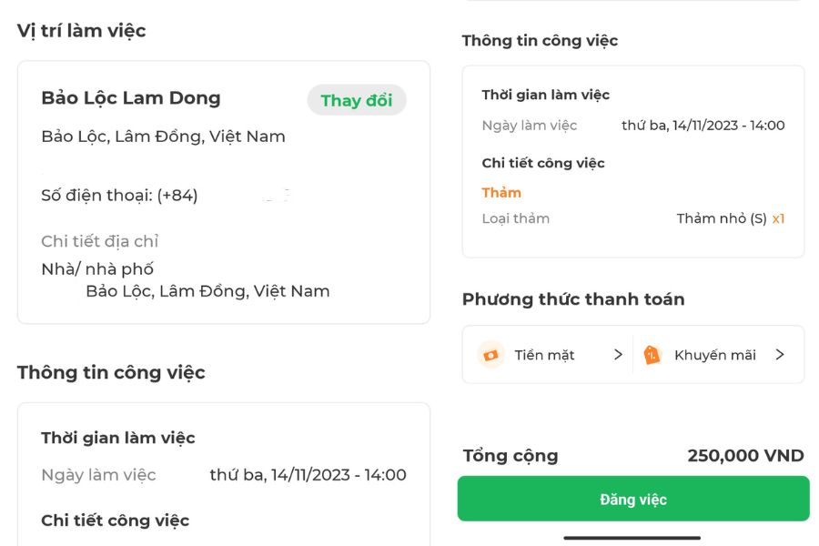 - Bước 6: Kiểm tra lại các thông tin đã nhập để đảm bảo chính xác, sau đó chọn phương thức thanh toán và nhấn chọn Đăng việc.