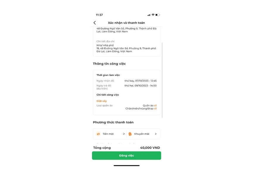 Bước 4: Xác nhận và thanh toán trực tuyến: Xác nhận lại các thông tin như địa chỉ, số điện thoại, thời gian giao nhận, phương thức thanh toán trước khi đăng công việc.