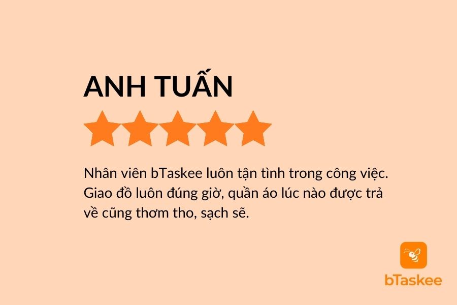 Anh Tuấn – ngụ quận Sơn Trà – Đà Nẵng chia sẻ: “Vợ tôi thường xuyên đi công tác xa, vì thế việc giặt ủi tôi làm cũng không thành thạo lắm. Sau khi biết đến dịch vụ giặt ủi Đà Nẵng, tôi cảm thân an tâm hơn hẳn khi vợ vắng nhà. Nhân viên bTaskee luôn tận tình trong công việc. Giao đồ luôn đúng giờ, quần áo lúc nào được trả về cũng thơm tho, sạch sẽ.”