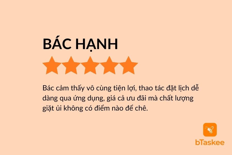 Bác Hạnh – ngụ quận Hải Châu – Đà Nẵng review về dịch vụ giặt ủi bTaskee: “2 vợ chồng bác tuổi cũng đã cao, rất khó khăn trong việc tự giặt đồ nặng như chăn, màn. Từ ngày có dịch vụ giặt ủi Đà Nẵng, bác cảm thấy vô cùng tiện lợi, thao tác đặt lịch dễ dàng qua ứng dụng, giá cả ưu đãi mà chất lượng giặt ủi không có điểm nào để chê.”