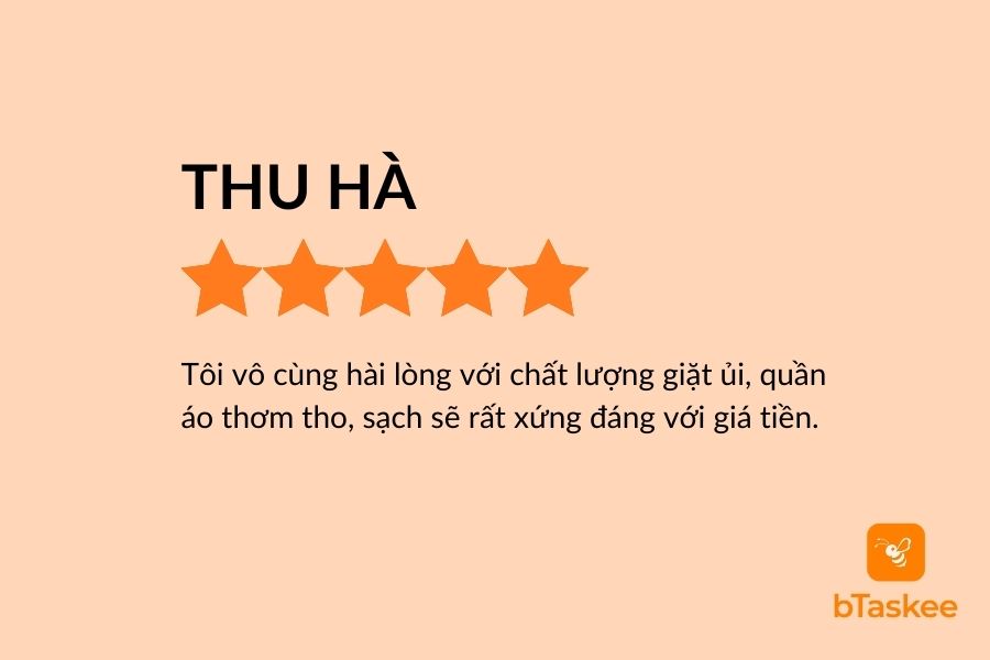 Chị Thu Hà – ngụ Thanh Khê – Đà Nẵng chia sẻ: “ Tôi book dịch vụ giặt ủi Đà Nẵng tháng 3 năm nay, thời điểm mà trời nồm ẩm, quần áo khó khô, ẩm mốc. May mắn là tôi được biết đến dịch vụ giặt ủi của bTaskee, tôi vô cùng hài lòng với chất lượng giặt ủi, quần áo thơm tho, sạch sẽ rất xứng đáng với giá tiền.”