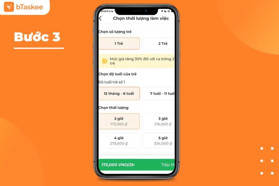 Bước 3: Chọn số lượng trẻ cần trông và thời lượng làm việc.