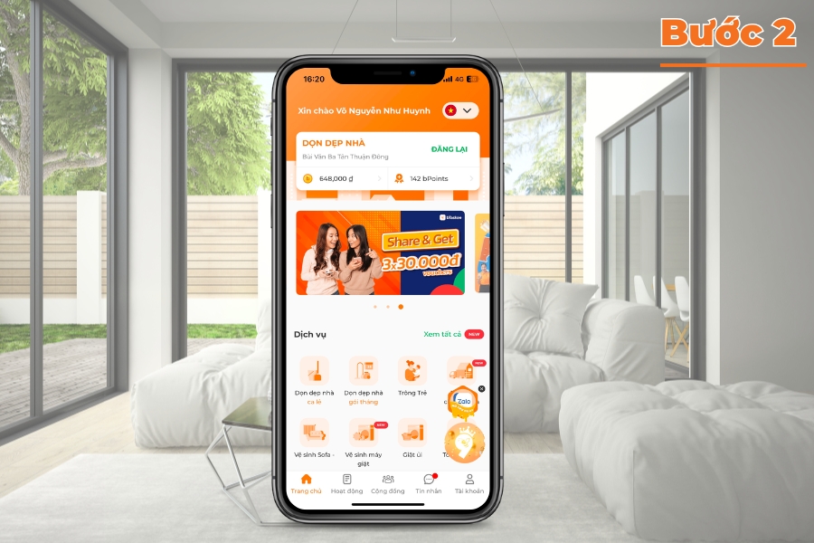 Mở ứng dụng bTaskee và đăng nhập vào tài khoản. Tại màn hình chính, chọn biểu tượng “Dọn dẹp nhà” hoặc “Dọn dẹp nhà theo gói” nếu bạn muốn đặt lịch cố định hàng tuần hoặc hàng tháng.