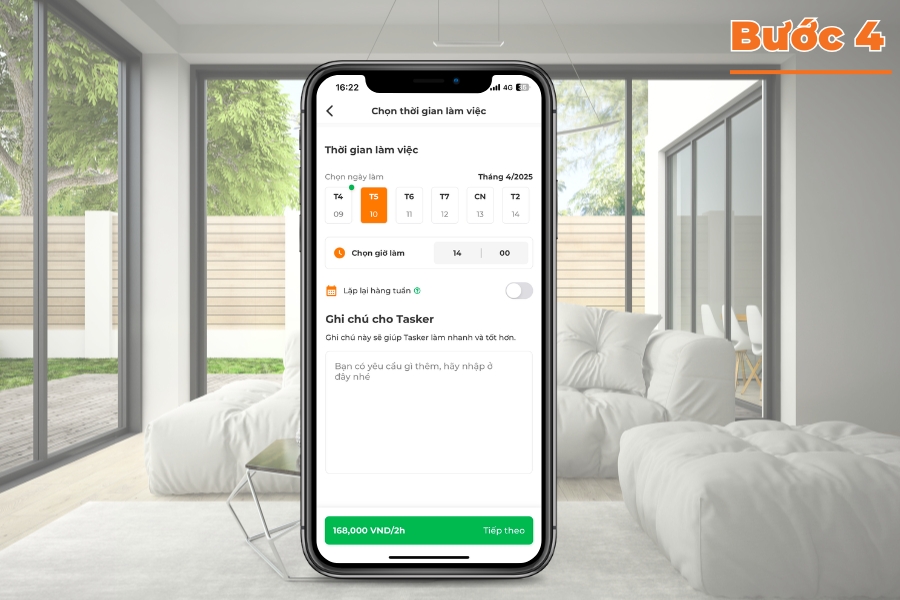 Chọn thời gian bạn muốn cộng tác viên đến làm việc. Lưu ý chọn khung giờ phù hợp với lịch trình của bạn, nên đặt trước ít nhất 2-3 giờ tại khu vực trung tâm hoặc 1 ngày đối với khu vực ngoại thành.