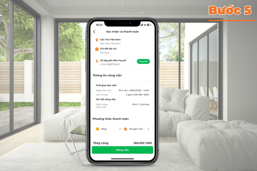 Kiểm tra lại thông tin đặt lịch và xác nhận. Tại Cần Thơ, bTaskee hỗ trợ nhiều phương thức thanh toán: